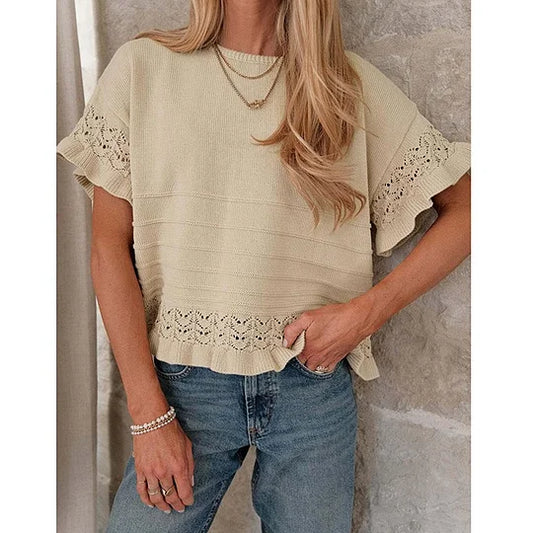 Pull d'été à manches courtes et volants pour femme, en tricot ou crochet, coupe courte