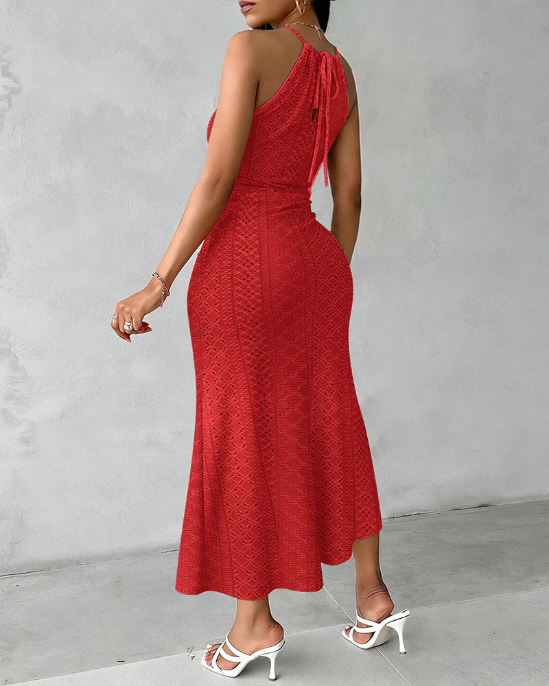Halter Cross Front Knit Jacquard Textured Slit Dress – Sophisticated Style with a Modern Edge